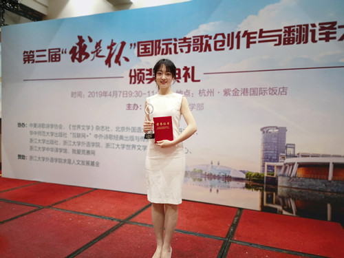 4月7日上午,由浙江大学、中美诗歌诗学协会、北京外国语大学外国文学研究所、《世界文学》杂志社、浙江大学出版社等单位共同举办的第三届“求是杯”国际诗歌创作与翻译大赛在杭州紫金港国际酒店举行颁奖典礼。我校william威廉官网2018级俄语专业研究生张颖坤同学以翻译作品《十一月挽歌》荣获全国翻译类二等奖。这是我校俄语专业研究生继第二届“求是杯”获得奖项之后又一次获奖。